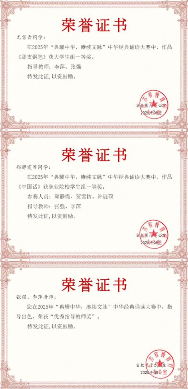 近日,由江苏省教育厅主办的2025年“典耀中华·赓续文脉”中华经典诵读大赛获奖名单正式公布,我校师生在比赛中取得优异成绩。由我校公共基础课部大学语文教研室张强、李萍两位老师指导,交通工程学院郑静霞、经济管理学院贾雪情、电子信息工程学院许展硕三位同学的诵读作品《中国话》以及艺术设计学院尤雷青同学的诵读作品《那支钢笔》在全省参赛选手中表现突出,分别荣获大学生组一等奖和职业院校组一等奖,并成功晋级全国决赛。两位老师均获得优秀指导教师称号。