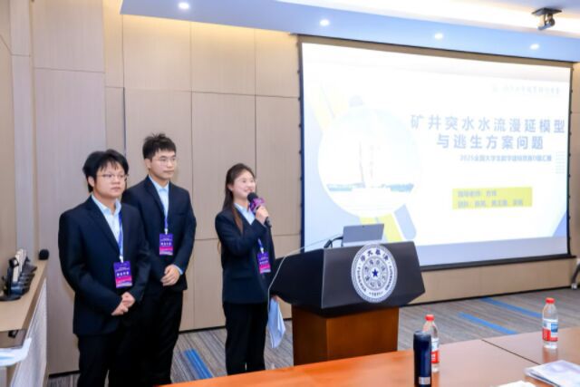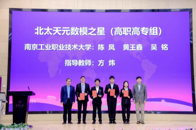 在清华大学建筑馆报告厅颁奖现场,南京工业职业技术大学通信2411班陈凤、航动2411班黄王鑫和电气2311班吴铭三名同学与指导教师公共基础课部方炜副教授,共同从清华大学陈松蹊院士与北太振寰科技有限公司首席科学家、北京大学李若教授手中,郑重接过了本届竞赛高职高专组全国“北太天元数模之星”奖杯与证书。团队成员陈凤同学发表获奖感言,黄王鑫同学做分享报告。