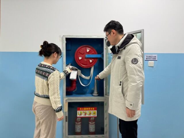 教师们系统学习了火灾预防、报警及逃生知识,并重点进行了消防器材实操演练。现场,两位老师密切配合,完整练习了消防水带的连接、展开、启阀和收卷全套流程。通过亲身体验水带的重量与阀门的操作力度,教师们对应急设施的使用要领有了更精准的掌握。